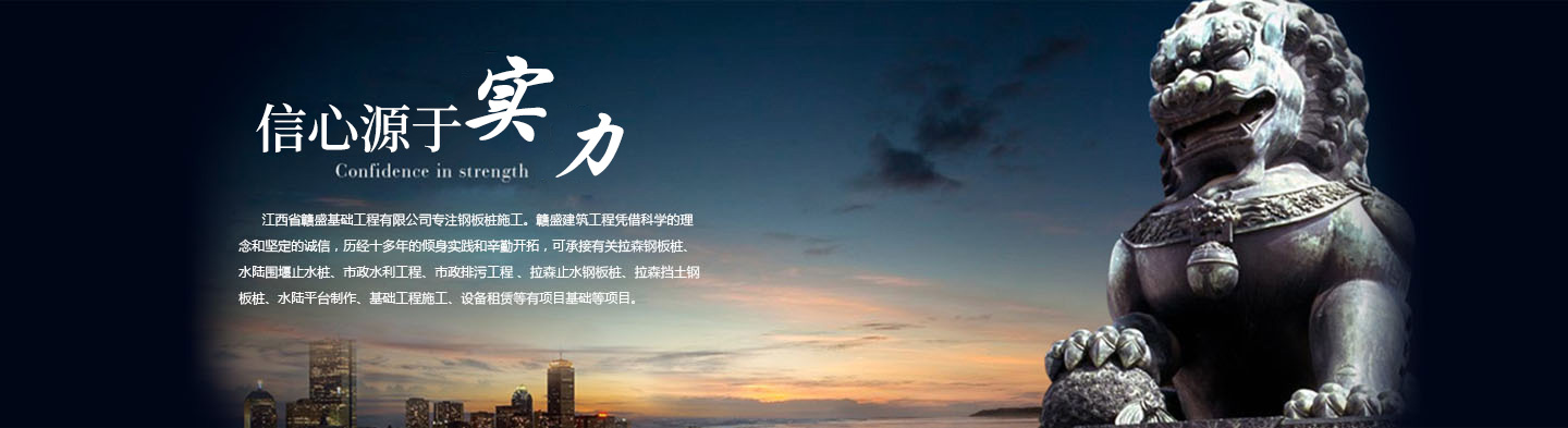 江西省贛盛基礎(chǔ)工程有限公司鋼板樁施工。贛 盛建筑工程憑借科學(xué)的理念和堅(jiān)定的誠(chéng)信,歷經(jīng)十多年的傾身實(shí)踐和辛勤開(kāi)拓,可承接有關(guān)拉森鋼板樁、水陸圍堰止水樁、市政水利工程、市政排污工程 、拉森止水鋼板樁、拉森擋土鋼板樁、水陸平臺(tái)制作、基礎(chǔ)工程施工、設(shè)備租賃等有項(xiàng)目基礎(chǔ)等項(xiàng)目。 ...